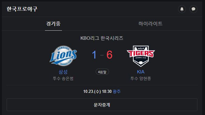 | 10월 22일 KBO 리그 한국시리즈 삼성 대 기아 (samsung vs kia) (1) | 2024.10.22 |