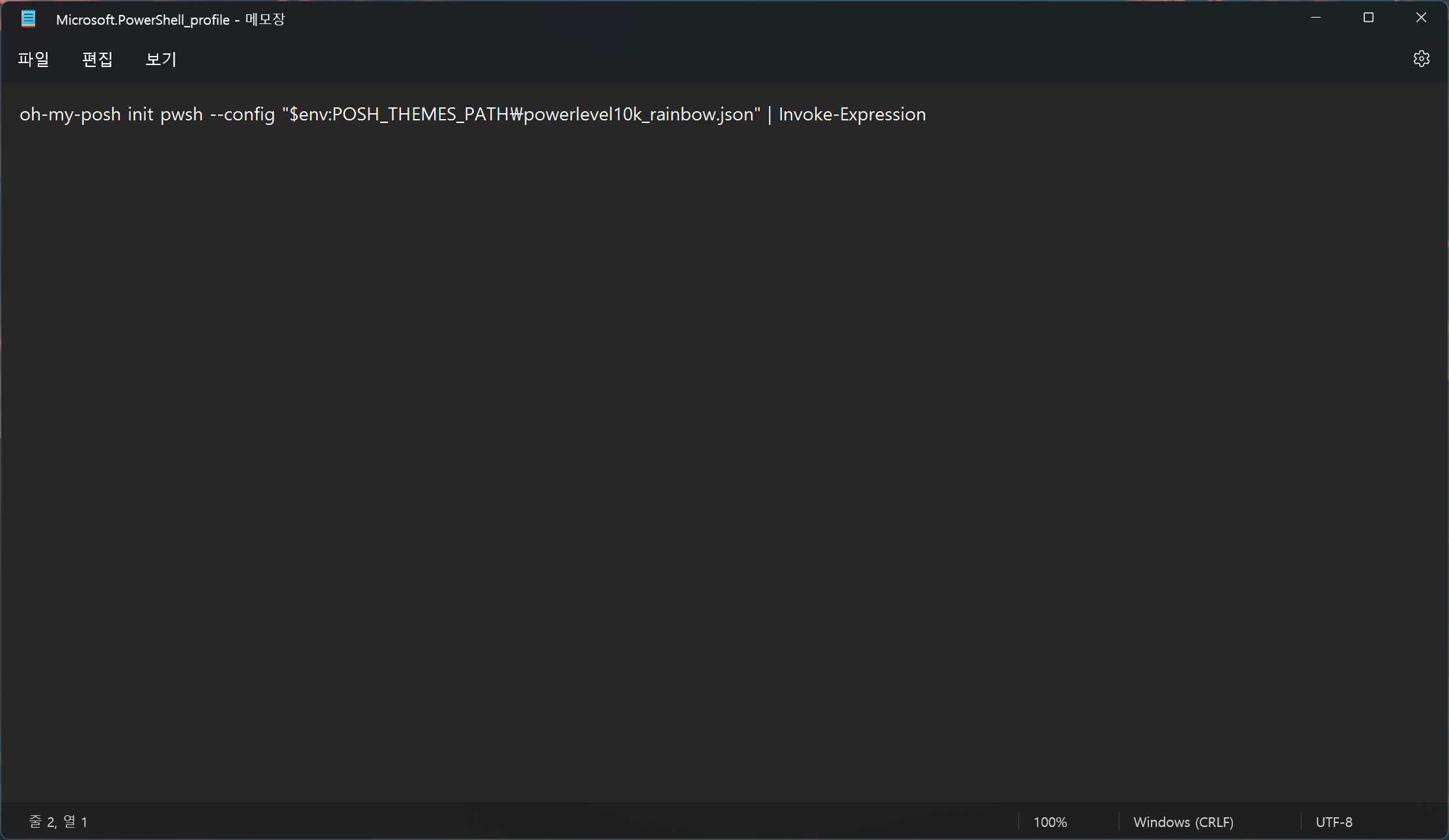 POSH_THEMES_PATH 는 on-my-posh 가 설치된 테마폴더의 위치이며 powerlevel10k_rainbow.json 이 테마 이름입니다.