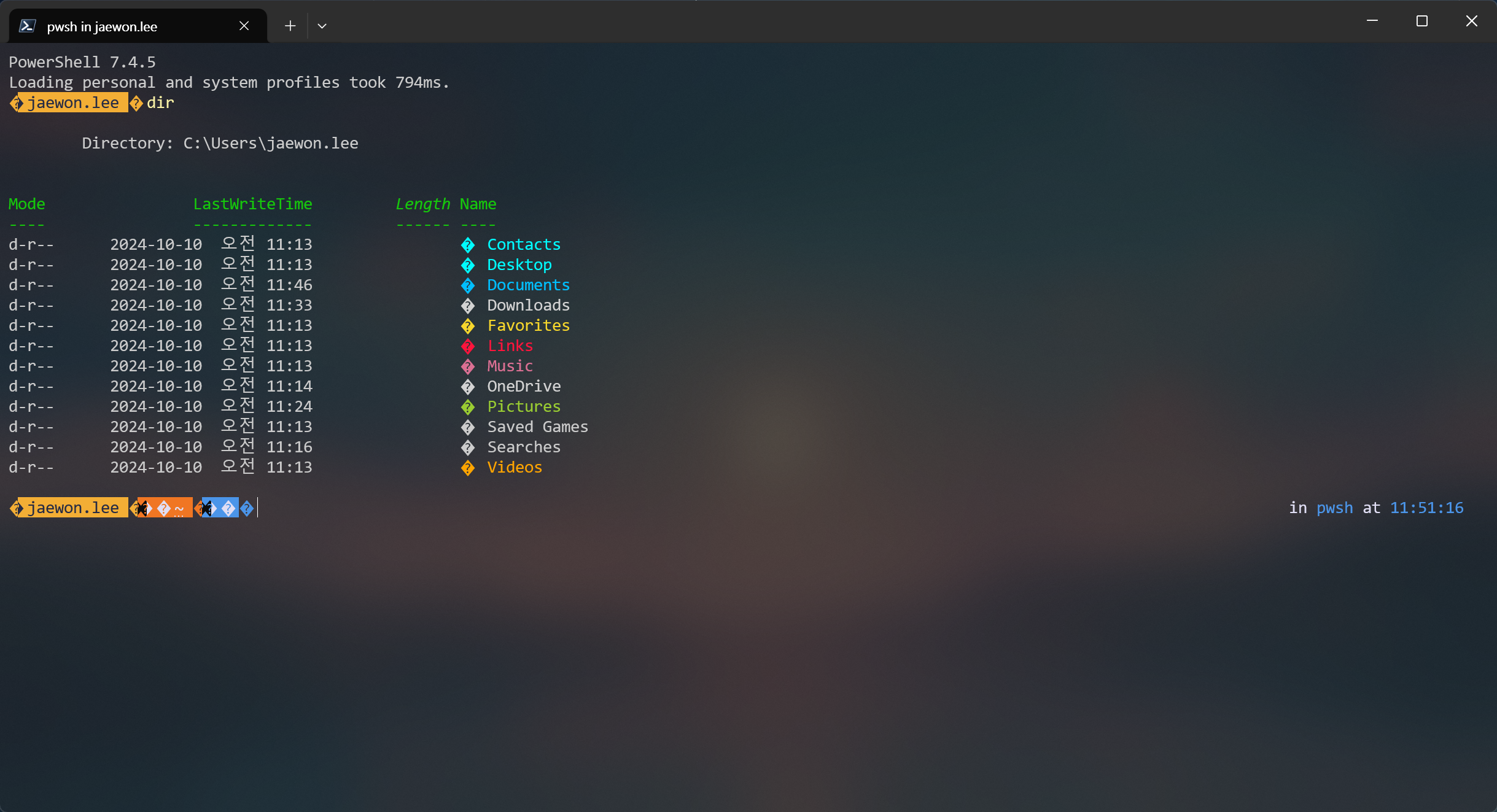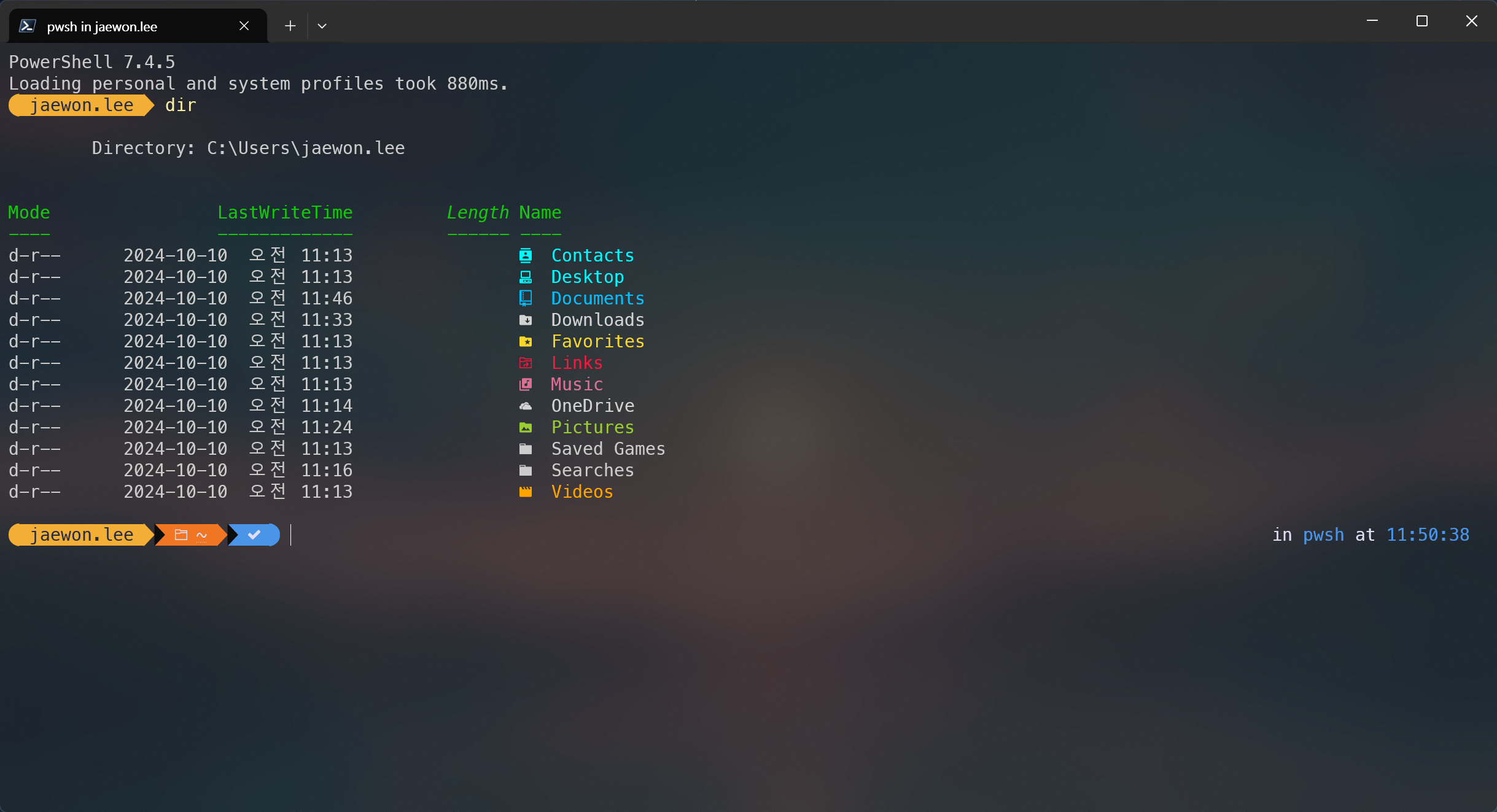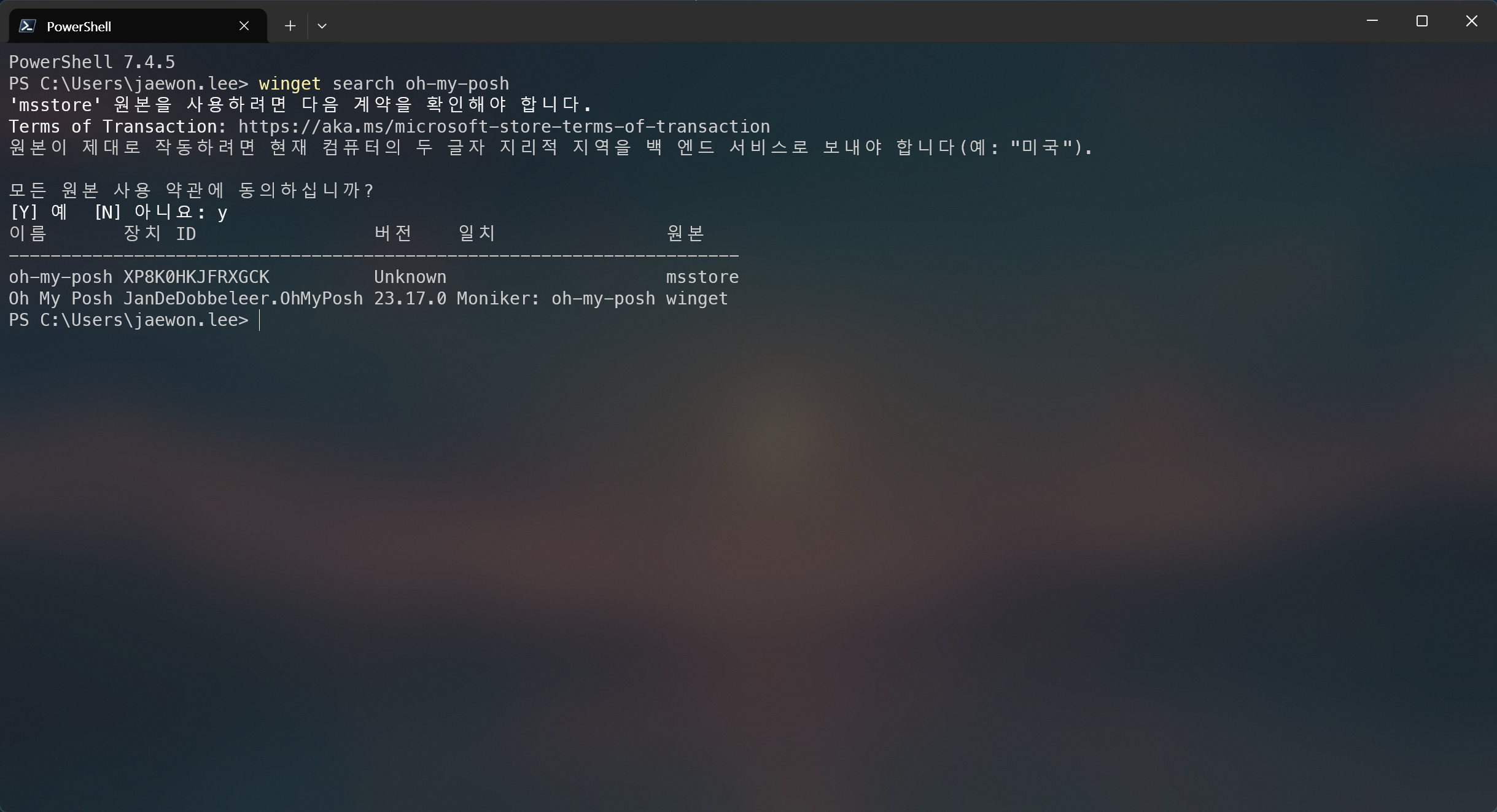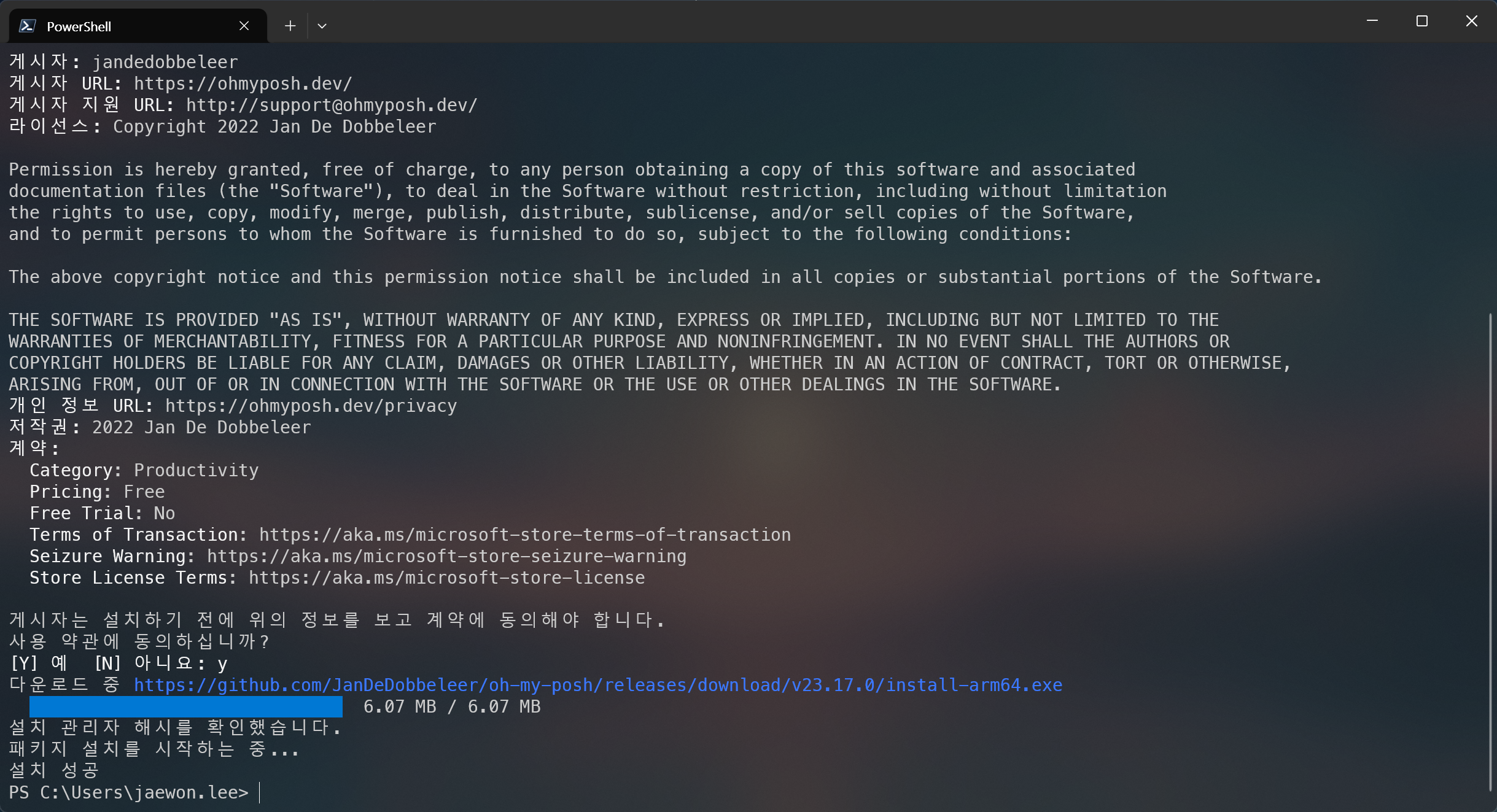 Power Shll 터미널에서 아래 명령을 입력하면 on-my-posh 테마가 나타납니다.