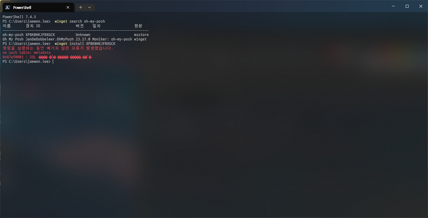 위와 같이 오류가 발생한다면 winget 에 sql db 가 깨진것으 보여지며 탐색기에서 아래 폴더 이동 후 %LOCALAPPDATA%\Packages\Microsoft.DesktopAppInstaller_8wekyb3d8bbwe\LocalState\StoreEdgeFD\installed.db 해당파일 삭제를 하면 정상적으로 설치가 가능합니다.